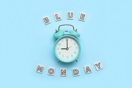 Text BLUE MONDAY with alarm clock