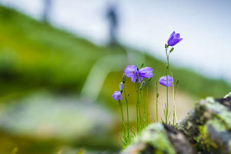 Swiss Alps Valley with Flowers. Campanula cochleariifolia wildflower in Alp meadow landscape. Beautiful view of idyllic alpine mountain scenery with blooming meadows on a beautiful sunny summer day.