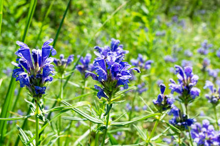 Blue flowers in green grass in sunny weather