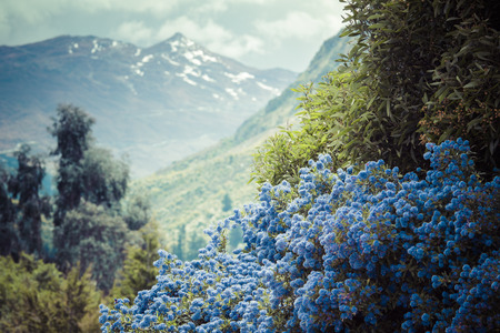 Mountains in the distance and blue flowers in the foreground