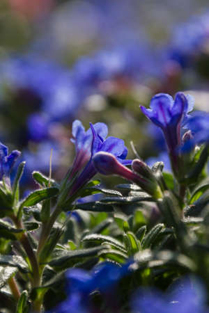 Blurred floral background with purple flowers of Gentiana septemfida.