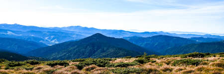 View while climbing Mount Hoverla. View of the mountain, forests and clouds. Ukrainian Carpathians. Blue sky. Nature landscape