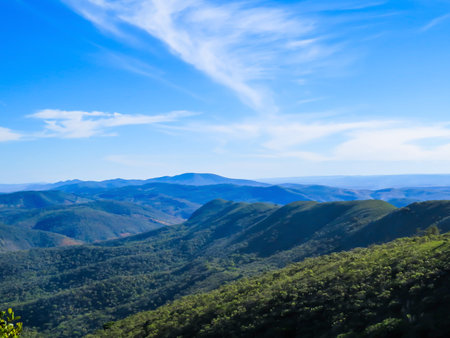 A serene landscape of rolling hills and mountains covered in lush green forests under a blue sky