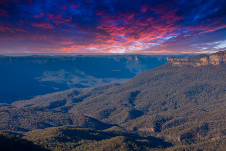 Photograph of a bright red sunset in a large green valley near Katoomba in the Blue Mountains in New South Wales in Australia