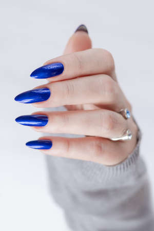 Woman's beautiful hand with long nails and bright blue nail polish