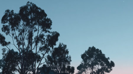 A quiet evening sky showcases silhouetted eucalyptus trees against soft pastel hues as dusk falls, creating a serene atmosphere ideal for nature lovers and photography.