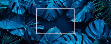 Blue tropical leaves with rectangular frame, nature background. Botanical concept