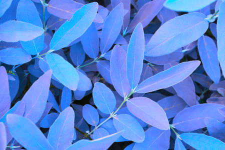 Unusual bright tinted vegetable background. Light blue, purple, violet colors. Bush foliage close-up. Fantastic vivid plant backdrop or wallpaper from honeysuckle leaves