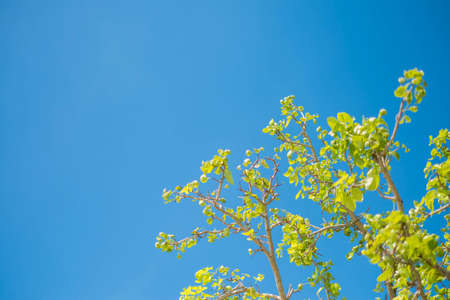 Tree with bare branches in nature on a sunny spring day and blue sky in the background. Close up and copy space for text or design