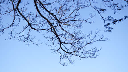 Branched tree branch against blue sky in the evening