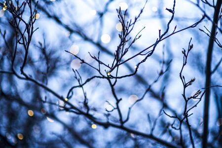 Branches of a tree without leaves decorated with Christmas balls and garlands against the night sky.