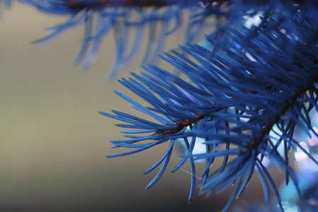 Bright blue needles on a fluffy branch of a blue spruce close-up outdoors on a sunny sparkling background. New Year card. Christmas background.