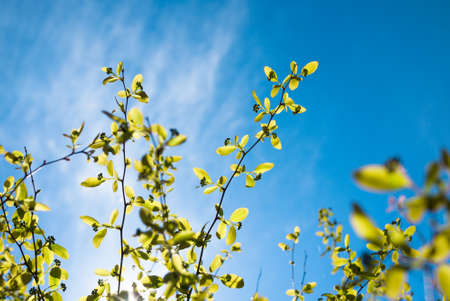 Branches on cloudless sky in the garden at morning sun.