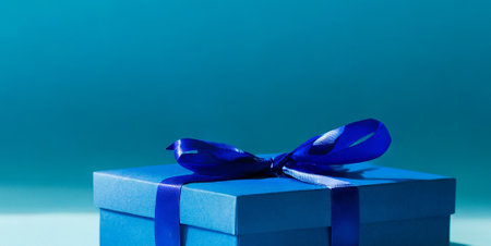 Blue gift box with blue ribbon on blue background. Close up.
