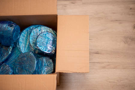 Glassware wrapped with blue wrapping nylon at the bottom of a cardboard box. Glassware wrapped in a box