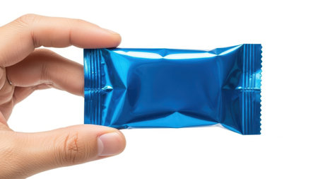 Hand holding blue candy wrapper isolated on white background