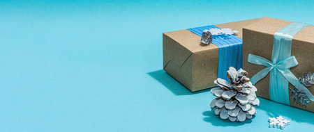 presents wrapping and packaging. holiday traditions and handcraft. gift boxes in craft paper and tied with yellow twine on blue background.