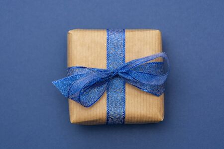 Gift box wrapped in kraft paper on a blue background. Top view, holiday concept.