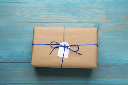 Handmade gift. Holiday surprise. Care package. Special day congratulation. Present wrapped in vintage beige rustic paper box isolated on blue copy space background.