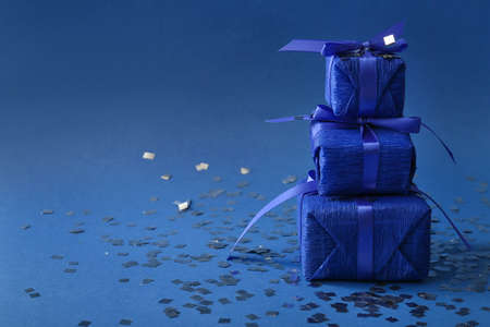 Stack of Christmas gifts on blue background