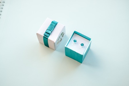 Beautiful small boxes with gifts on a turquoise background. Space for text.