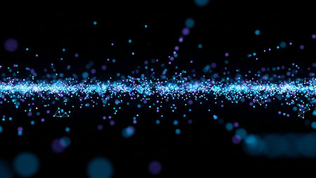 Abstract digital particles and network connections glowing in blue and purple on a dark background.