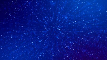 Abstract vortex particles background. Dynamic blue wave moving in explosion. Wormhole shimmering star dust. 3d rendering.
