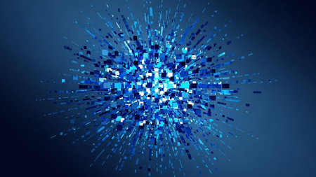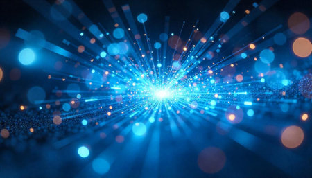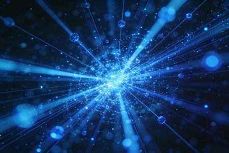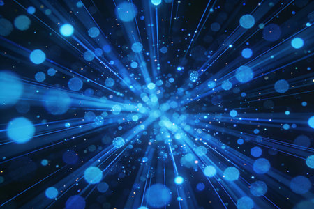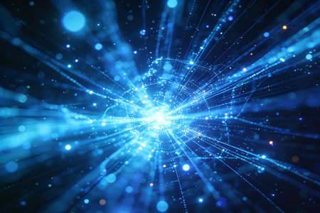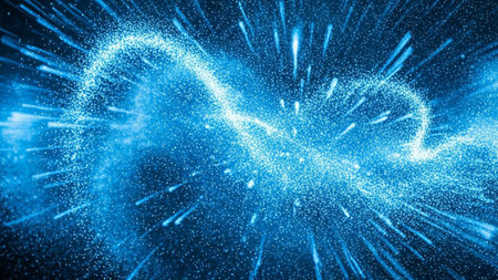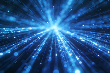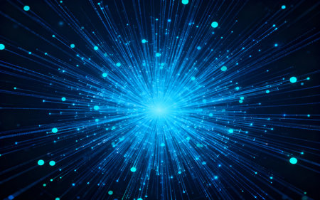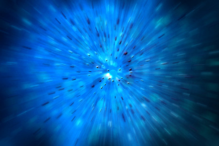 A vibrant and dynamic abstract featuring a swirling vortex of bright blue energy particles. Streaks of light radiate outwards from the central mass, creating a sense of explosive motion and cosmic energy. The background is a deep, dark blue, enhancing the luminous of the particles and light trails. This visual evokes themes of science, technology, and the vastness of space.