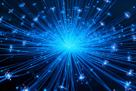 A close-up of fiber optic cables with glowing blue data streams.