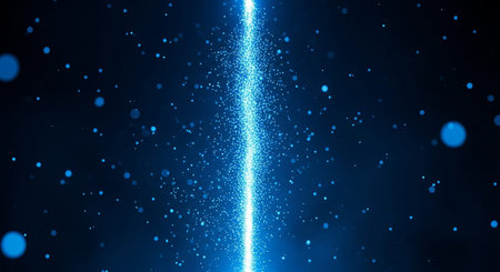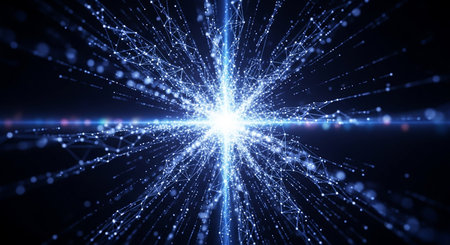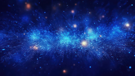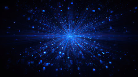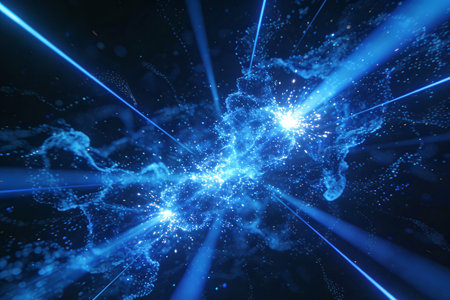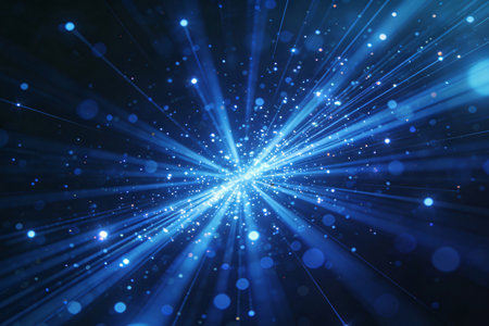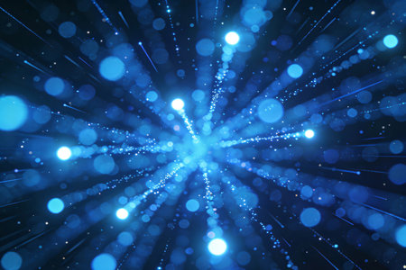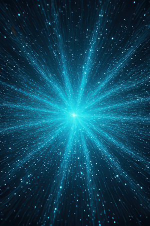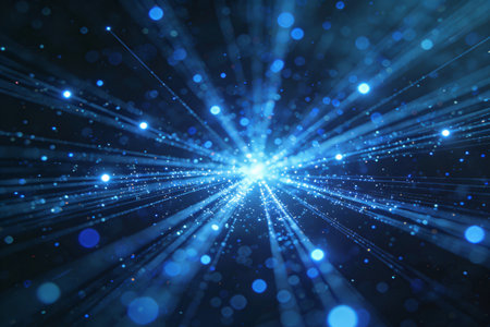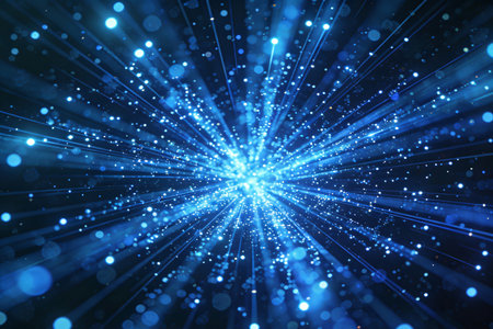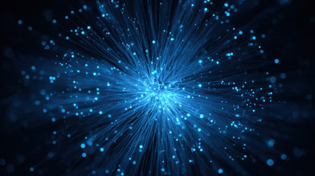 Experience a captivating cosmic blue burst of light particles that radiate energy and movement against a dark background, perfect for design.