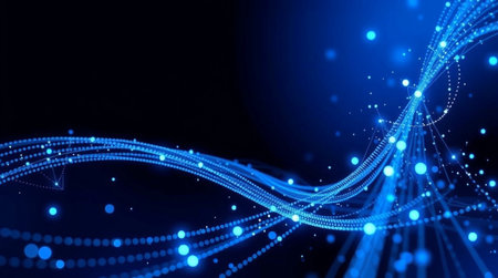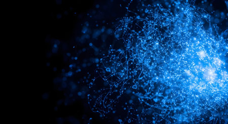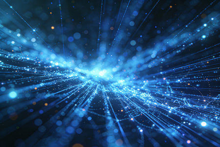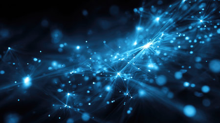 Abstract blue light particles forming a dynamic network against a dark background, representing technology, data, energy, and digital connectivity