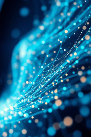 Abstract background with bokeh effect. Glowing particles form lines and points.