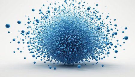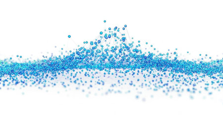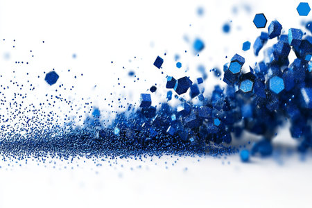 The image depicts a serene and abstract scene featuring numerous blue particles suspended in a white, empty space. The particles vary in size and are concentrated more densely towards the bottom, gradually thinning out as they rise. The overall effect is one of tranquility and ethereal beauty, with the blue particles creating a gentle, calming atmosphere.