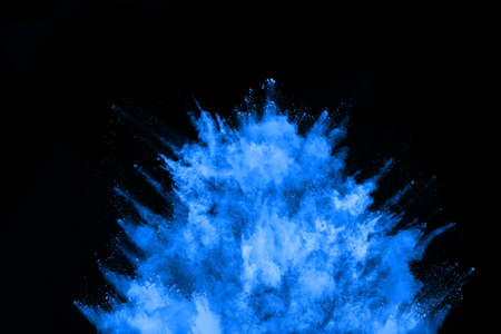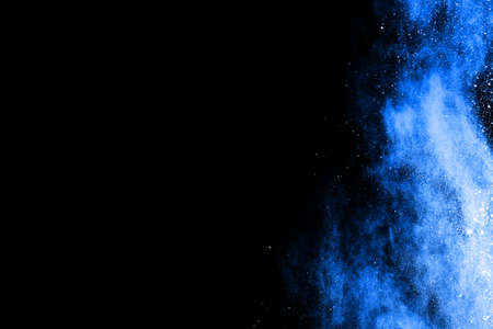 Blue powder explosion on black background. Colored cloud. Colorful dust explode. Paint Holi.