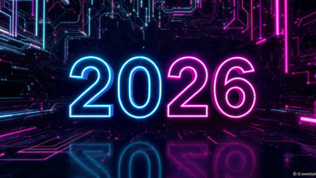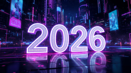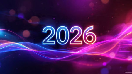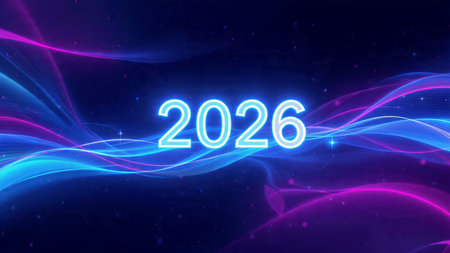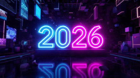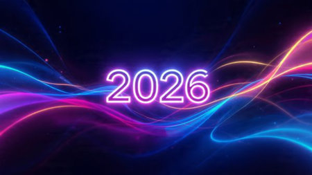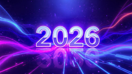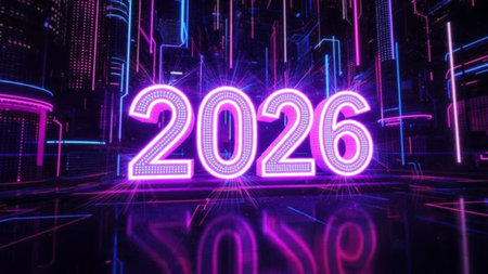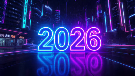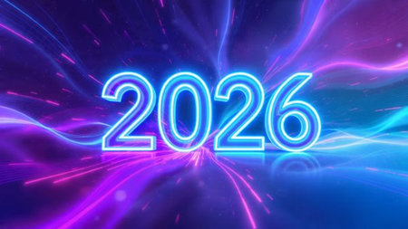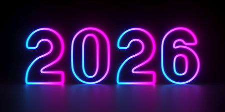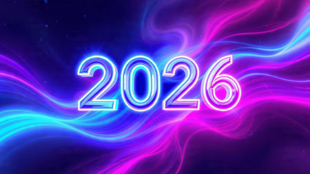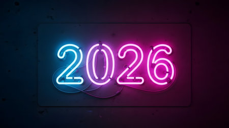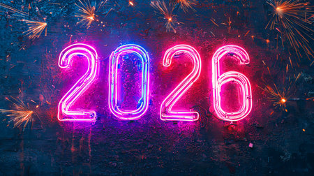 Neon numbers 2026 in blue and pink glow against a dark textured wall. Clear details and vibrant c...