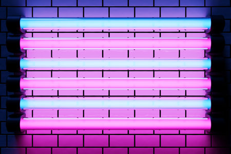 3D illustration of a new brick wall and a illuminated by neon blue ights