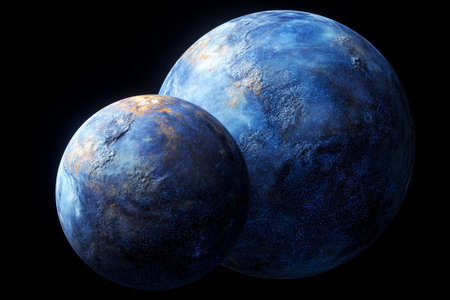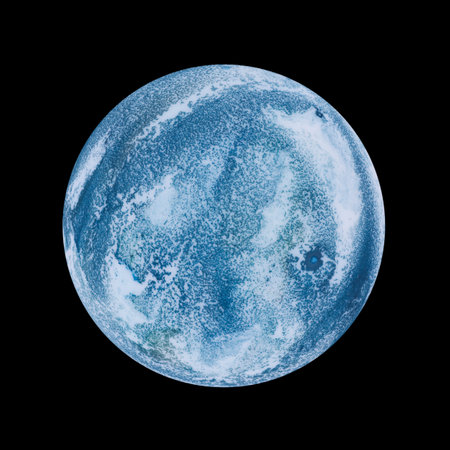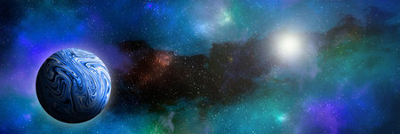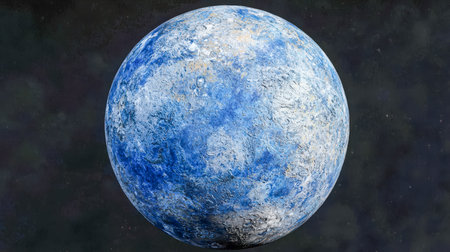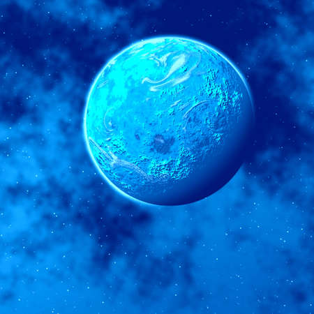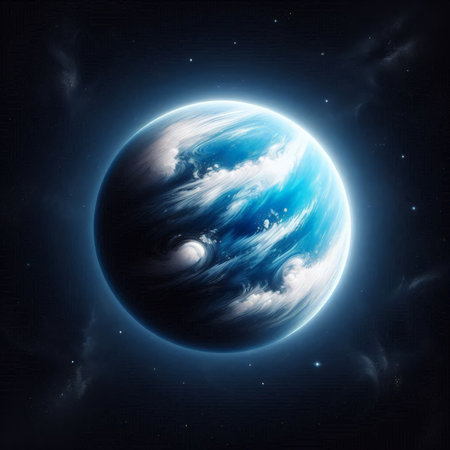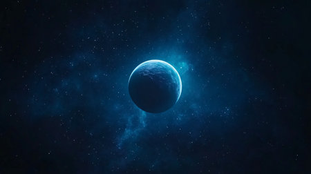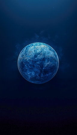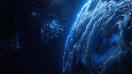 An abstract cosmic scene featuring a textured sphere with swirling blue and white hues, set against a vast, dark stellar backdrop.