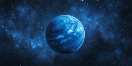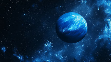 Delve into the enchanting beauty of Neptune, an exquisite blue planet gracefully floating amidst the mesmerizing vastness of the galaxy, adorned by twinkling stars and ethereal cosmic clouds