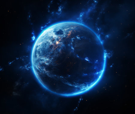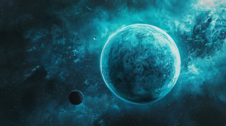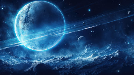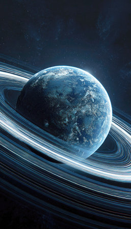 An illustration depicts a vibrant blue planet surrounded by rings and floating debris against a dark backdrop. The artwork showcases a digital style with illuminated elements and subtle textures. The scene suggests a celestial environment suitable for scientific visualizations or creative designs, potentially for various commercial applications.
