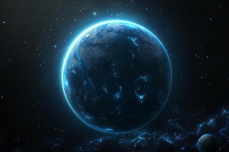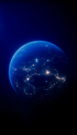 An illustration of a glowing blue planet with city lights against a dark outer space background.