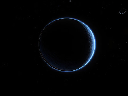 A celestial body is depicted with a luminous blue outline, contrasting with the encompassing black space. The image displays a circular shape, possibly a planet or moon. It showcases a high-contrast style, emphasizing the glow. Suitable for conceptual designs, science presentations, or artistic illustrations, this visual offers creative flexibility.