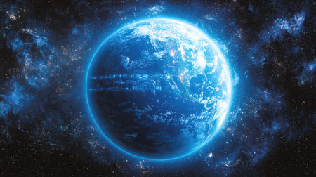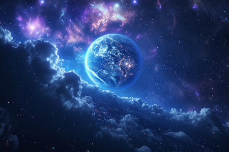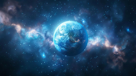 This captivating image showcases a vibrant blue Earth amidst a backdrop of twinkling stars and cosmic elements, evoking a sense of wonder and exploration.