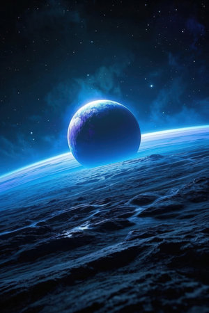 Textured icy terrain illuminated softly, set against a vast, dark cosmic backdrop dotted with shimmering stars, evoking a mysterious extraterrestrial