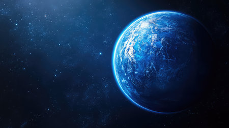 The Earth is prominently displayed against the backdrop of a star-filled cosmos, showing its vibrant colors and contours. The scene highlights the planet's atmosphere and the surrounding darkness of space, creating a captivating contrast. Distant stars twinkle, adding depth and beauty to the expansive view.
