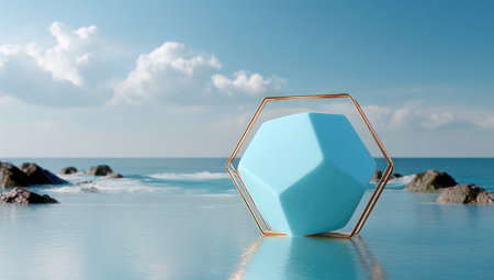 A blue geometric shape is centered within a gold hexagonal frame, floating on tranquil water. The background features a serene seascape under a bright blue sky with scattered clouds. The scene is lit by soft natural light. This imagery could be useful for various creative and commercial projects, illustrating concepts of design and balance.