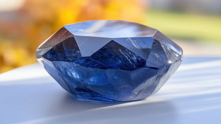 A stunning blue gemstone with brilliant facets captures light beautifully, perfect for artistic displays or elegant jewelry designs in natural settings.