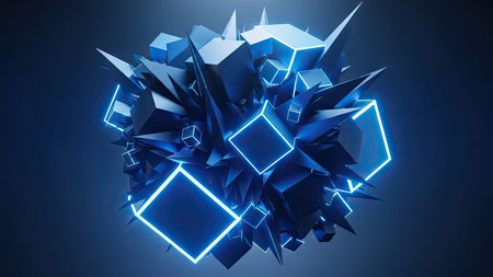 An abstract, three-dimensional geometric composition is presented. The image features a complex arrangement of sharp, angular shapes, with a cool blue color palette dominating the scene. The glowing neon outlines create depth and contrast against the dark background. This could be useful for modern design projects, digital art, or tech-related themes.