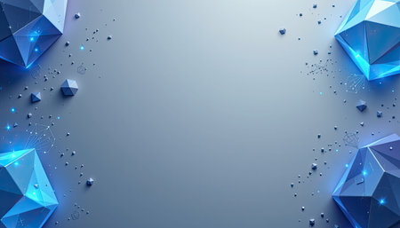 This abstract geometric background features blue polygons and scattered particles, creating a modern and elegant visual aesthetic on a soft gradient surface.