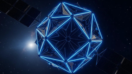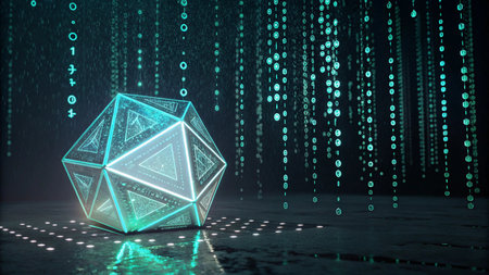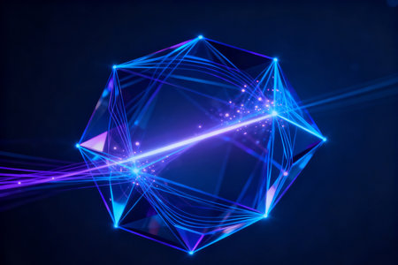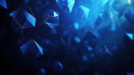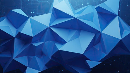 A complex, multifaceted blue geometric structure with sharp edges and planes, set against a dark background with faint digital circuit patterns and small luminous dots