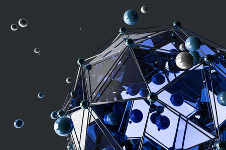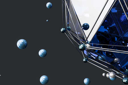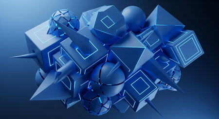 3d rendering of abstract geometric shapes in blue color background. Computer digital drawing.